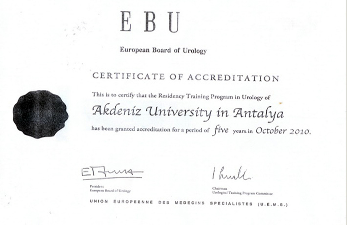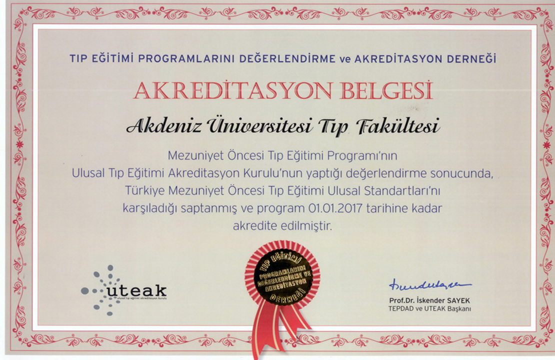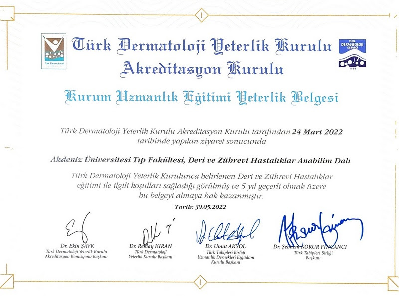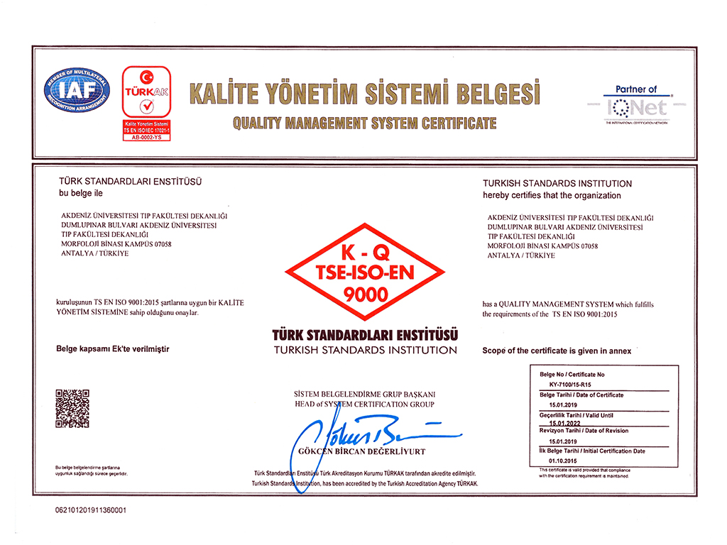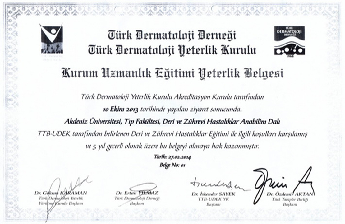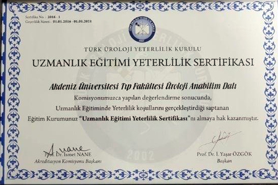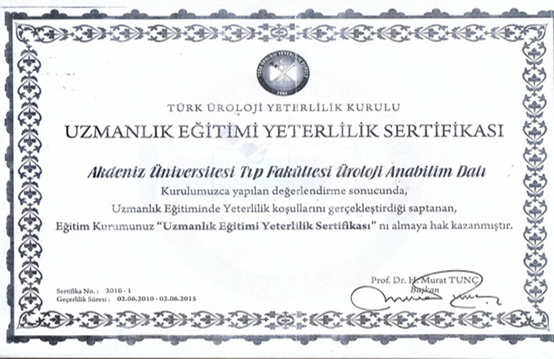 Our Certificates CHILDREN'S HEALTH AND DISEASES ACCREDITATION CERTIFICATE OF SPECIALTY TRAINING INSTITUTION OF THE SPECIALTY QUALIFICATION BOARD IN MEDICINE (16-08.2022-16.08.2027) TURKISH DERMATOLOGY COMPETENCE BOARD ACCREDITATION BOARD INSTITUTION SPECIALTY EDUCATION QUALIFICATION CERTIFICATE (24.03.2022-24.03.2027) ALGOLOGY MEDICAL SPECIALTY QUALIFICATION BOARD INSTITUTION MEDICAL SPECIALTY EDUCATION QUALIFICATION CERTIFICATE (15.10.2021-15.10.2026) QUALITY MANAGEMENT SYSTEM CERTIFICATE (25.01.2022 – 25.01.2025) QUALITY MANAGEMENT SYSTEM CERTIFICATE-2- (25.01.2022 – 25.01.2025) THE INTERNATİONAL CERTİFİCATİON NETWORK (25.01.2022 – 25.01.2025) THE INTERNATİONAL CERTİFİCATİON NETWORK SPOCE OF THE CERTİFİCATE (25.01.2022 – 25.01.2025) QUALITY MANAGEMENT SYSTEM CERTIFICATE (15.01.2019 – 15.01.2022) QUALITY MANAGEMENT SYSTEM CERTIFICATE-2- (15.01.2019 – 15.01.2022) THE INTERNATİONAL CERTİFİCATİON NETWORK (15.01.2019 – 15.01.2022) THE INTERNATİONAL CERTİFİCATİON NETWORK SPOCE OF THE CERTİFİCATE (15.01.2019 – 15.01.2022) QUALITY MANAGEMENT SYSTEM CERTIFICATE (01.10.2015 – 01.10.2018) QUALITY MANAGEMENT SYSTEM CERTIFICATE-2- (01.10.2015 – 01.10.2018) THE INTERNATİONAL CERTİFİCATİON NETWORK (01.10.2015 – 01.10.2018) THE INTERNATİONAL CERTİFİCATİON NETWORK SCOPE OF THE CERTİFİCATE (01.10.2015 – 01.10.2018) ACCREDITATION CERTIFICATE OF MEDICAL PATHOLOGY COMPETENCE BOARD INSTITUTION SPECIALTY TRAINING (01.01.2019 – 01.01.2024) TURKISH UROLOGY QUALIFICATION BOARD SPECIALTY EDUCATION QUALIFICATION CERTIFICATE (01.01.2016 – 01.01.2021) TURKISH UROLOGY QUALIFICATION BOARD SPECIALTY EDUCATION QUALIFICATION CERTIFICATE (02.06.2010 – 02.06.2016) ASSOCIATION FOR EVALUATION AND ACCREDITATION OF MEDICAL EDUCATION PROGRAMS ACCREDITATION CERTIFICATE OF THE FACULTY OF MEDICINE (01.01.2017) ASSOCIATION FOR EVALUATION AND ACCREDITATION OF MEDICAL EDUCATION PROGRAMS ACCREDITATION CERTIFICATE OF THE FACULTY OF MEDICINE (01.01.2023) EUROPEAN BOARD OF UROLOGY CERTİFİCATE OF ACCREDİTATİON (2010-2015) TURKISH DERMATOLOGY ASSOCIATION INSTITUTION SPECIALTY TRAINING QUALIFICATION CERTIFICATE (10.10.2013 – 10.10.2018) TURKISH RADIOLOGY ASSOCIATION QUALIFICATION BOARD INSTITUTION SPECIALTY TRAINING QUALIFICATION CERTIFICATE (02.06.2014 – 02.06.2019) MEDİCAL BOARD OF CALİFORNİA Eklenme tarihi :14.07.2023 11:06:14 Son güncelleme : 14.07.2023 16:11:23