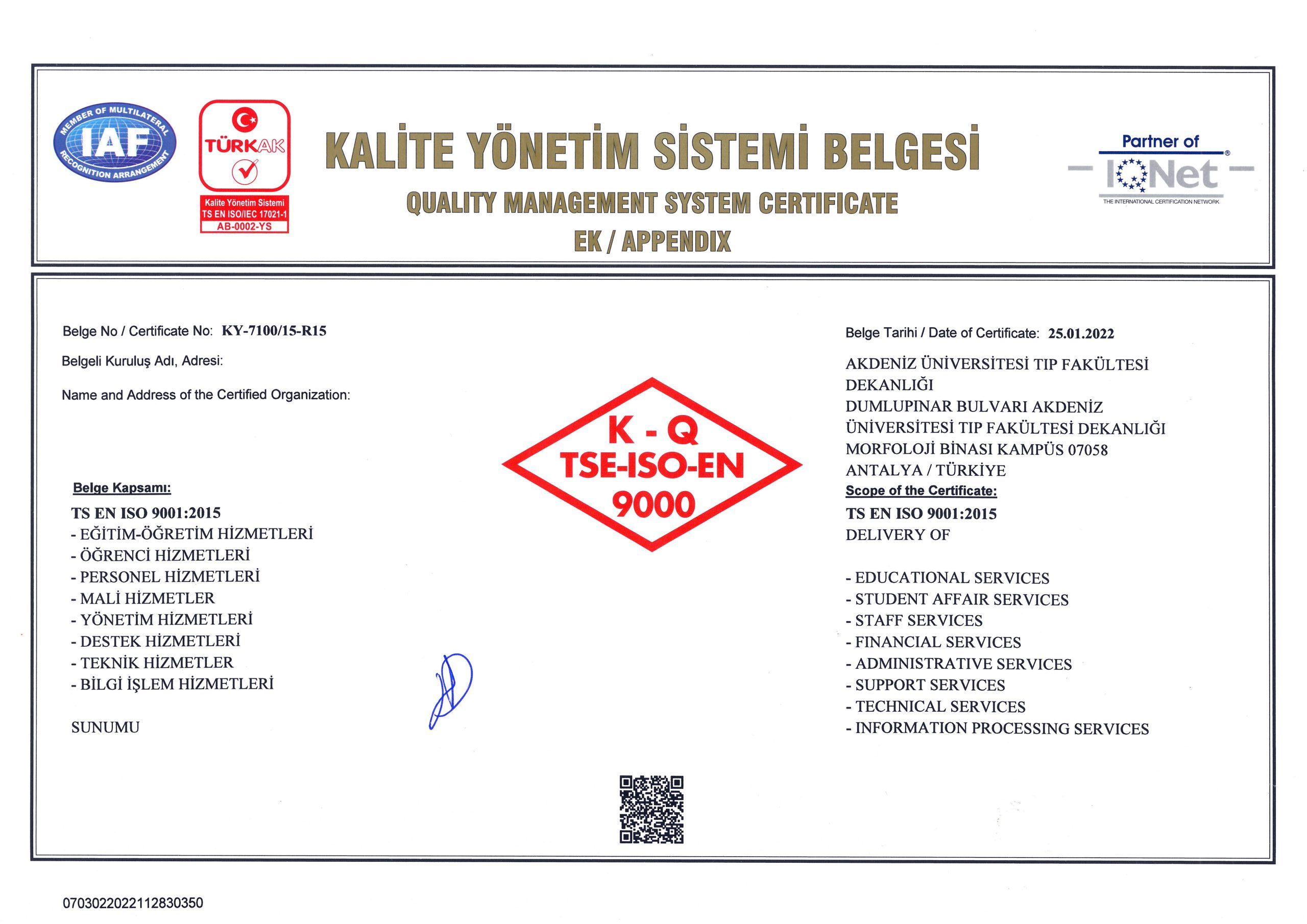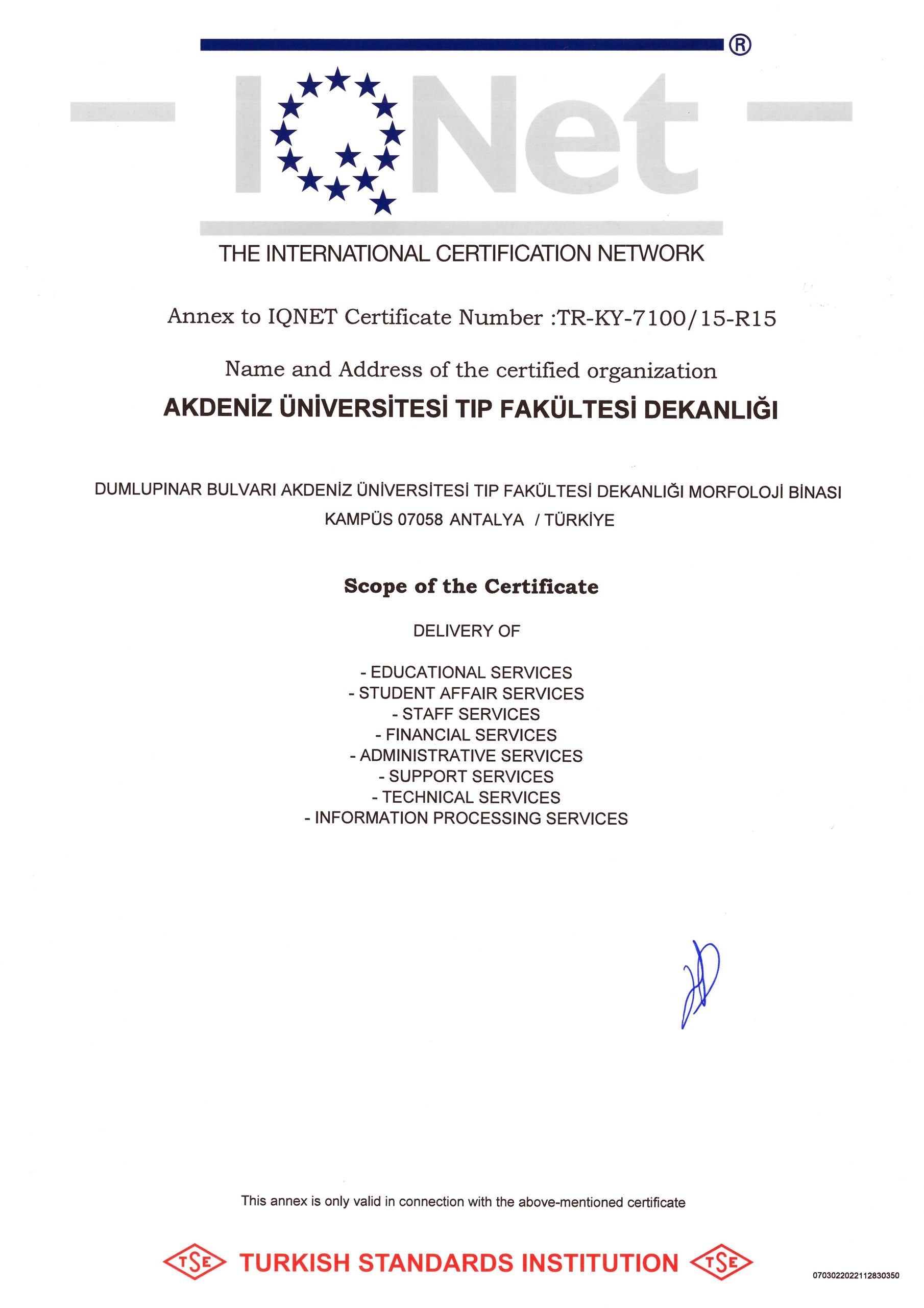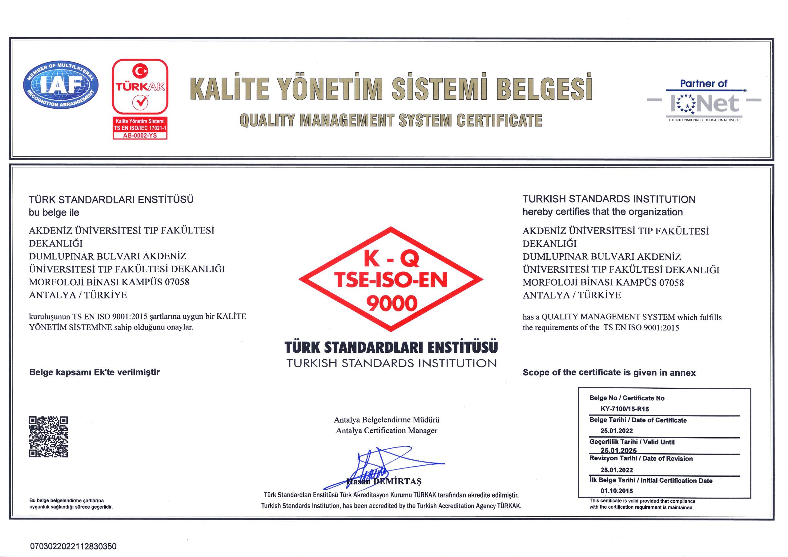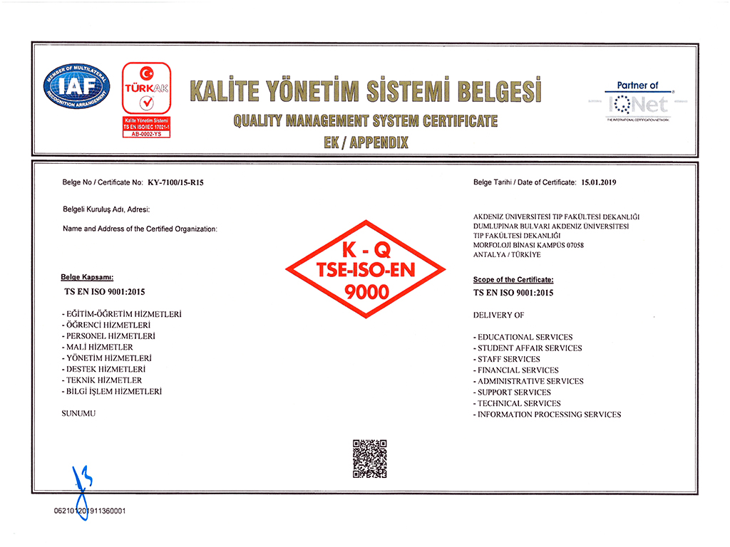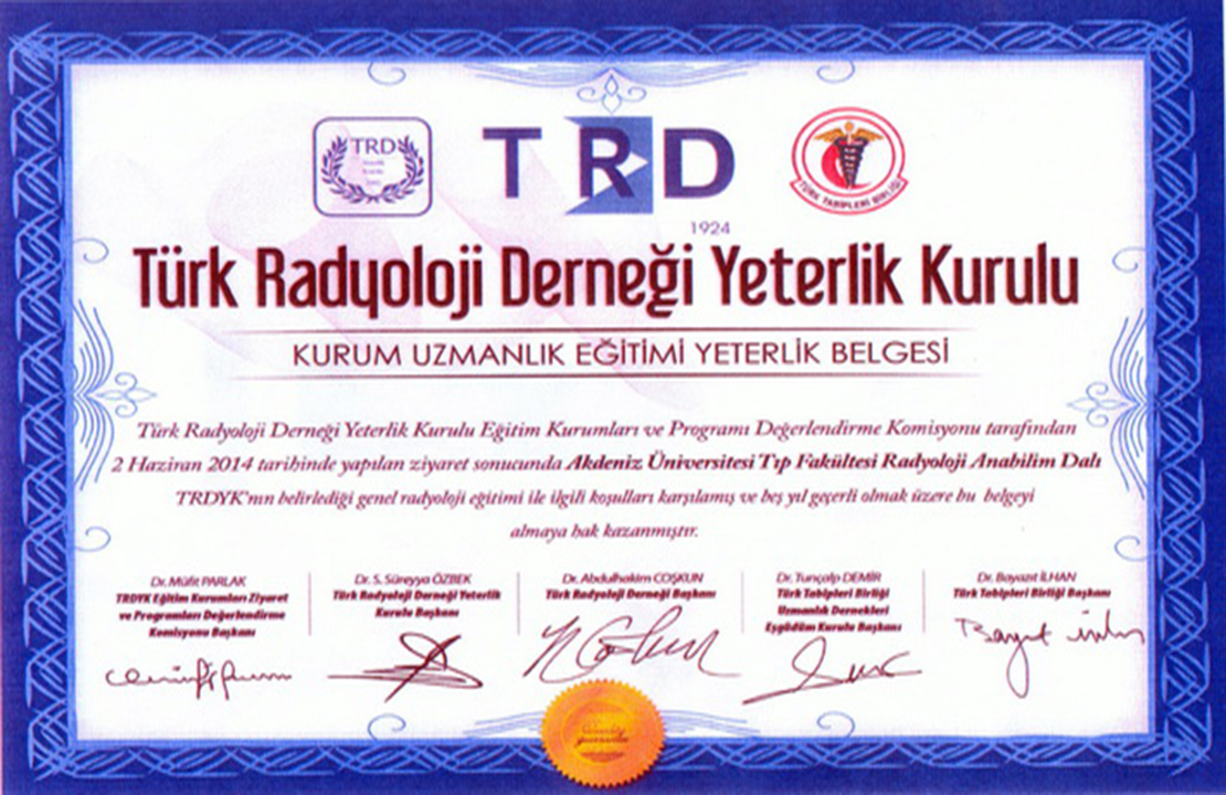 Our Certificates CHILDREN'S HEALTH AND DISEASES ACCREDITATION CERTIFICATE OF SPECIALTY TRAINING INSTITUTION OF THE SPECIALTY QUALIFICATION BOARD IN MEDICINE (16-08.2022-16.08.2027) TURKISH DERMATOLOGY COMPETENCE BOARD ACCREDITATION BOARD INSTITUTION SPECIALTY EDUCATION QUALIFICATION CERTIFICATE (24.03.2022-24.03.2027) ALGOLOGY MEDICAL SPECIALTY QUALIFICATION BOARD INSTITUTION MEDICAL SPECIALTY EDUCATION QUALIFICATION CERTIFICATE (15.10.2021-15.10.2026) QUALITY MANAGEMENT SYSTEM CERTIFICATE (25.01.2022 – 25.01.2025) QUALITY MANAGEMENT SYSTEM CERTIFICATE-2- (25.01.2022 – 25.01.2025) THE INTERNATİONAL CERTİFİCATİON NETWORK (25.01.2022 – 25.01.2025) THE INTERNATİONAL CERTİFİCATİON NETWORK SPOCE OF THE CERTİFİCATE (25.01.2022 – 25.01.2025) QUALITY MANAGEMENT SYSTEM CERTIFICATE (15.01.2019 – 15.01.2022) QUALITY MANAGEMENT SYSTEM CERTIFICATE-2- (15.01.2019 – 15.01.2022) THE INTERNATİONAL CERTİFİCATİON NETWORK (15.01.2019 – 15.01.2022) THE INTERNATİONAL CERTİFİCATİON NETWORK SPOCE OF THE CERTİFİCATE (15.01.2019 – 15.01.2022) QUALITY MANAGEMENT SYSTEM CERTIFICATE (01.10.2015 – 01.10.2018) QUALITY MANAGEMENT SYSTEM CERTIFICATE-2- (01.10.2015 – 01.10.2018) THE INTERNATİONAL CERTİFİCATİON NETWORK (01.10.2015 – 01.10.2018) THE INTERNATİONAL CERTİFİCATİON NETWORK SCOPE OF THE CERTİFİCATE (01.10.2015 – 01.10.2018) ACCREDITATION CERTIFICATE OF MEDICAL PATHOLOGY COMPETENCE BOARD INSTITUTION SPECIALTY TRAINING (01.01.2019 – 01.01.2024) TURKISH UROLOGY QUALIFICATION BOARD SPECIALTY EDUCATION QUALIFICATION CERTIFICATE (01.01.2016 – 01.01.2021) TURKISH UROLOGY QUALIFICATION BOARD SPECIALTY EDUCATION QUALIFICATION CERTIFICATE (02.06.2010 – 02.06.2016) ASSOCIATION FOR EVALUATION AND ACCREDITATION OF MEDICAL EDUCATION PROGRAMS ACCREDITATION CERTIFICATE OF THE FACULTY OF MEDICINE (01.01.2017) ASSOCIATION FOR EVALUATION AND ACCREDITATION OF MEDICAL EDUCATION PROGRAMS ACCREDITATION CERTIFICATE OF THE FACULTY OF MEDICINE (01.01.2023) EUROPEAN BOARD OF UROLOGY CERTİFİCATE OF ACCREDİTATİON (2010-2015) TURKISH DERMATOLOGY ASSOCIATION INSTITUTION SPECIALTY TRAINING QUALIFICATION CERTIFICATE (10.10.2013 – 10.10.2018) TURKISH RADIOLOGY ASSOCIATION QUALIFICATION BOARD INSTITUTION SPECIALTY TRAINING QUALIFICATION CERTIFICATE (02.06.2014 – 02.06.2019) MEDİCAL BOARD OF CALİFORNİA Eklenme tarihi :14.07.2023 11:06:14 Son güncelleme : 14.07.2023 16:11:23