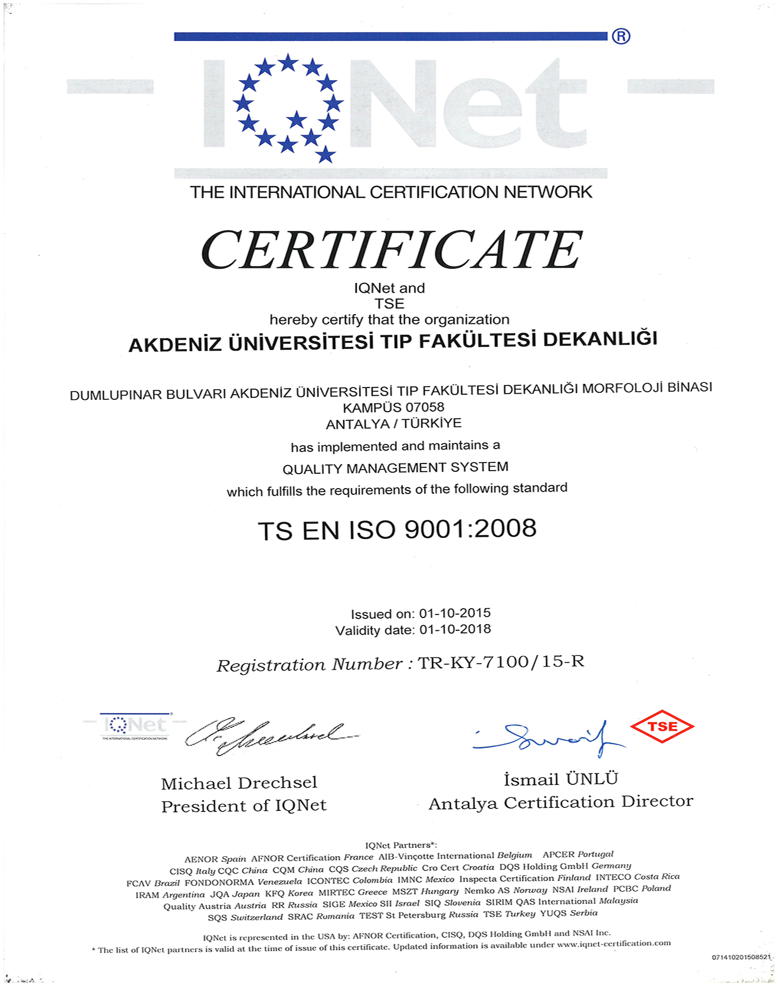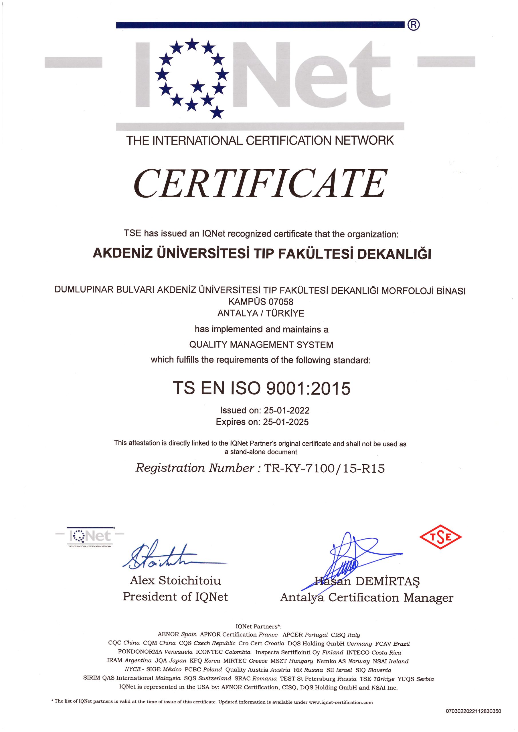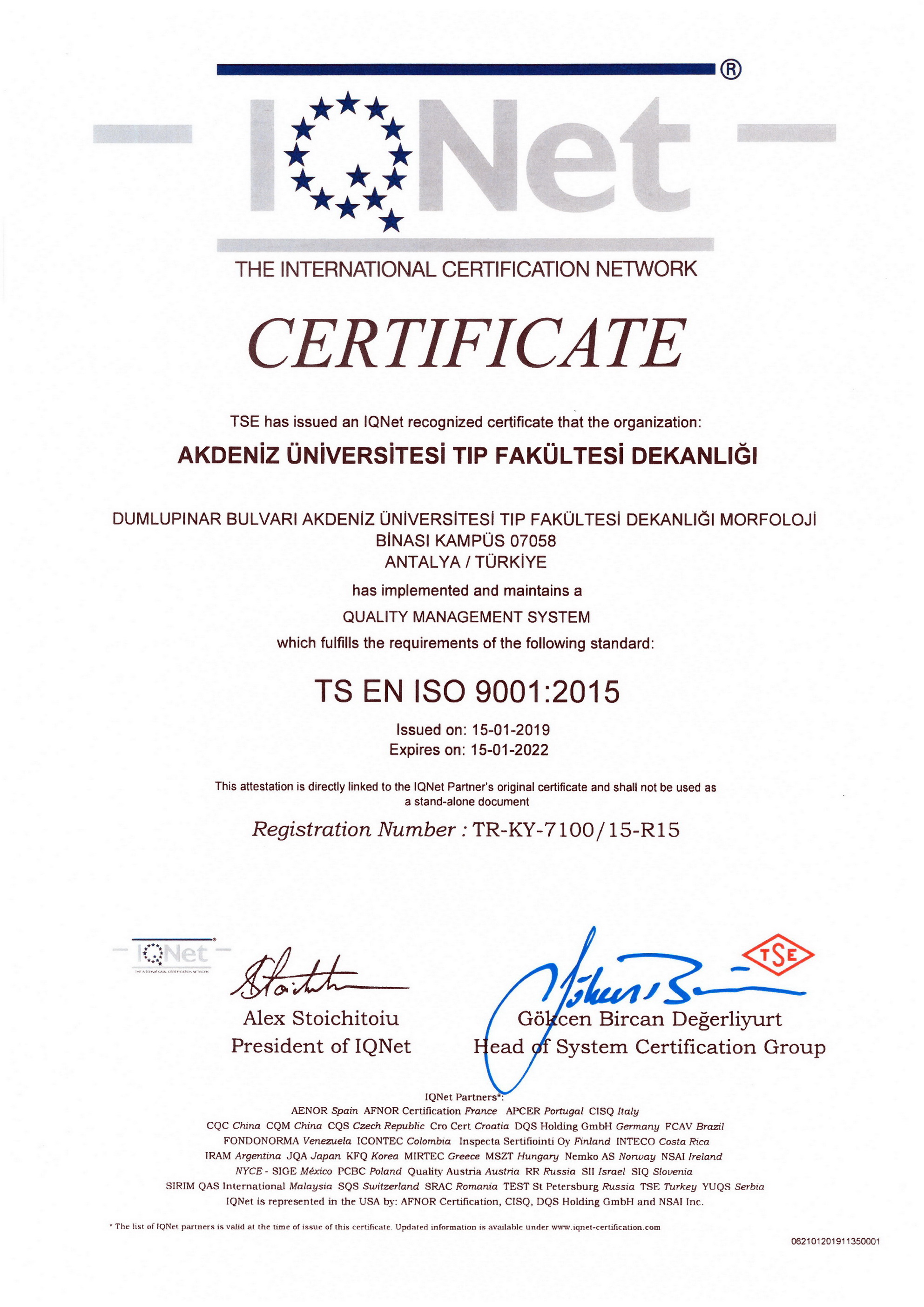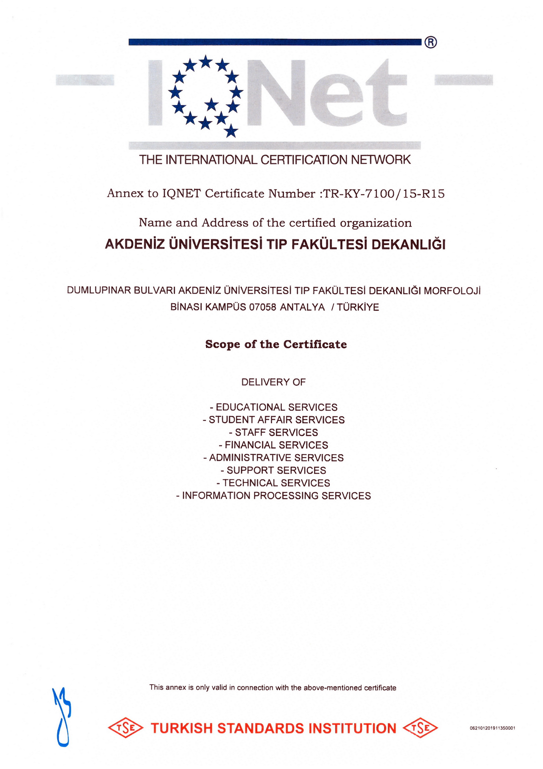 Our Certificates CHILDREN'S HEALTH AND DISEASES ACCREDITATION CERTIFICATE OF SPECIALTY TRAINING INSTITUTION OF THE SPECIALTY QUALIFICATION BOARD IN MEDICINE (16-08.2022-16.08.2027) TURKISH DERMATOLOGY COMPETENCE BOARD ACCREDITATION BOARD INSTITUTION SPECIALTY EDUCATION QUALIFICATION CERTIFICATE (24.03.2022-24.03.2027) ALGOLOGY MEDICAL SPECIALTY QUALIFICATION BOARD INSTITUTION MEDICAL SPECIALTY EDUCATION QUALIFICATION CERTIFICATE (15.10.2021-15.10.2026) QUALITY MANAGEMENT SYSTEM CERTIFICATE (25.01.2022 – 25.01.2025) QUALITY MANAGEMENT SYSTEM CERTIFICATE-2- (25.01.2022 – 25.01.2025) THE INTERNATİONAL CERTİFİCATİON NETWORK (25.01.2022 – 25.01.2025) THE INTERNATİONAL CERTİFİCATİON NETWORK SPOCE OF THE CERTİFİCATE (25.01.2022 – 25.01.2025) QUALITY MANAGEMENT SYSTEM CERTIFICATE (15.01.2019 – 15.01.2022) QUALITY MANAGEMENT SYSTEM CERTIFICATE-2- (15.01.2019 – 15.01.2022) THE INTERNATİONAL CERTİFİCATİON NETWORK (15.01.2019 – 15.01.2022) THE INTERNATİONAL CERTİFİCATİON NETWORK SPOCE OF THE CERTİFİCATE (15.01.2019 – 15.01.2022) QUALITY MANAGEMENT SYSTEM CERTIFICATE (01.10.2015 – 01.10.2018) QUALITY MANAGEMENT SYSTEM CERTIFICATE-2- (01.10.2015 – 01.10.2018) THE INTERNATİONAL CERTİFİCATİON NETWORK (01.10.2015 – 01.10.2018) THE INTERNATİONAL CERTİFİCATİON NETWORK SCOPE OF THE CERTİFİCATE (01.10.2015 – 01.10.2018) ACCREDITATION CERTIFICATE OF MEDICAL PATHOLOGY COMPETENCE BOARD INSTITUTION SPECIALTY TRAINING (01.01.2019 – 01.01.2024) TURKISH UROLOGY QUALIFICATION BOARD SPECIALTY EDUCATION QUALIFICATION CERTIFICATE (01.01.2016 – 01.01.2021) TURKISH UROLOGY QUALIFICATION BOARD SPECIALTY EDUCATION QUALIFICATION CERTIFICATE (02.06.2010 – 02.06.2016) ASSOCIATION FOR EVALUATION AND ACCREDITATION OF MEDICAL EDUCATION PROGRAMS ACCREDITATION CERTIFICATE OF THE FACULTY OF MEDICINE (01.01.2017) ASSOCIATION FOR EVALUATION AND ACCREDITATION OF MEDICAL EDUCATION PROGRAMS ACCREDITATION CERTIFICATE OF THE FACULTY OF MEDICINE (01.01.2023) EUROPEAN BOARD OF UROLOGY CERTİFİCATE OF ACCREDİTATİON (2010-2015) TURKISH DERMATOLOGY ASSOCIATION INSTITUTION SPECIALTY TRAINING QUALIFICATION CERTIFICATE (10.10.2013 – 10.10.2018) TURKISH RADIOLOGY ASSOCIATION QUALIFICATION BOARD INSTITUTION SPECIALTY TRAINING QUALIFICATION CERTIFICATE (02.06.2014 – 02.06.2019) MEDİCAL BOARD OF CALİFORNİA Eklenme tarihi :14.07.2023 11:06:14 Son güncelleme : 14.07.2023 16:11:23