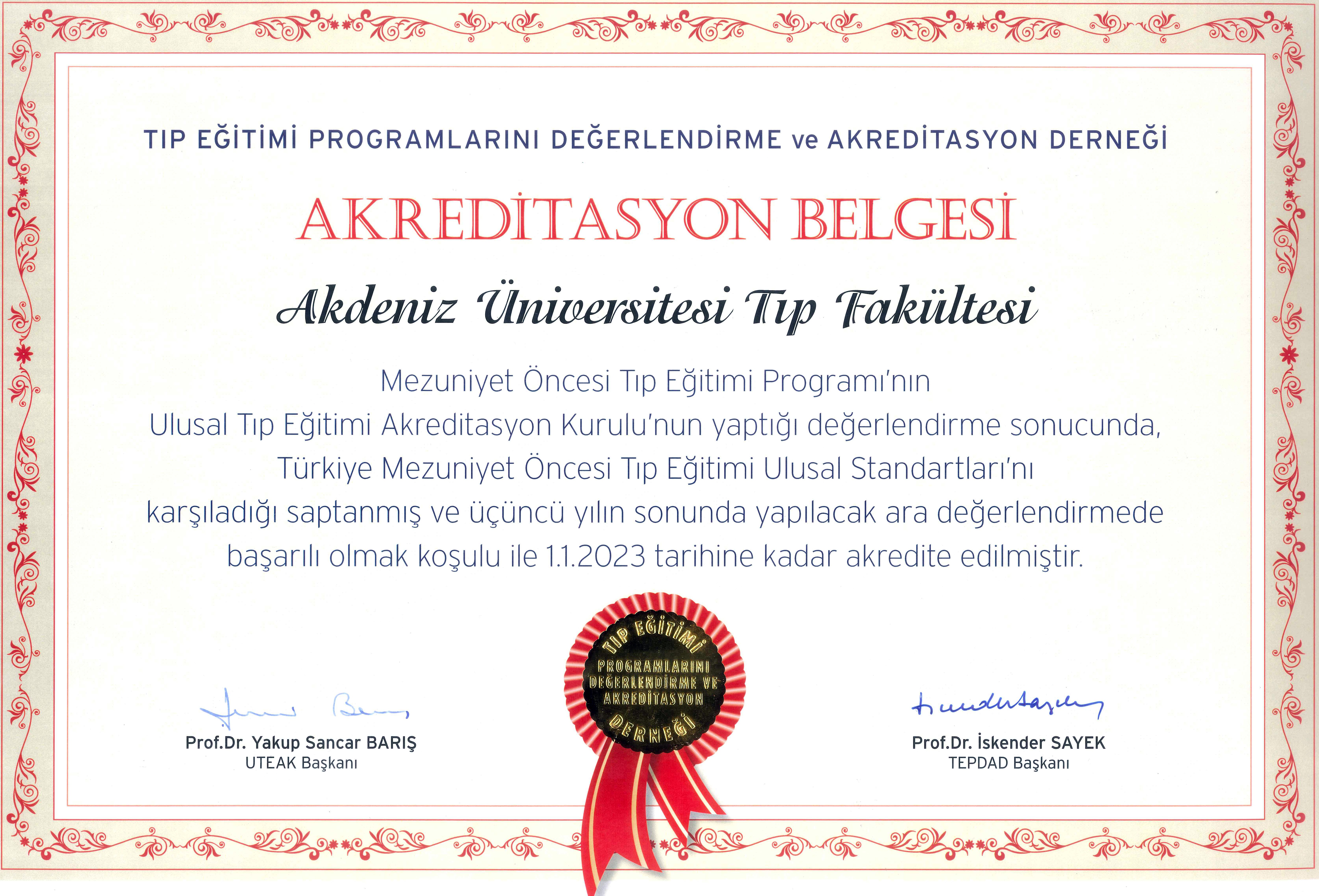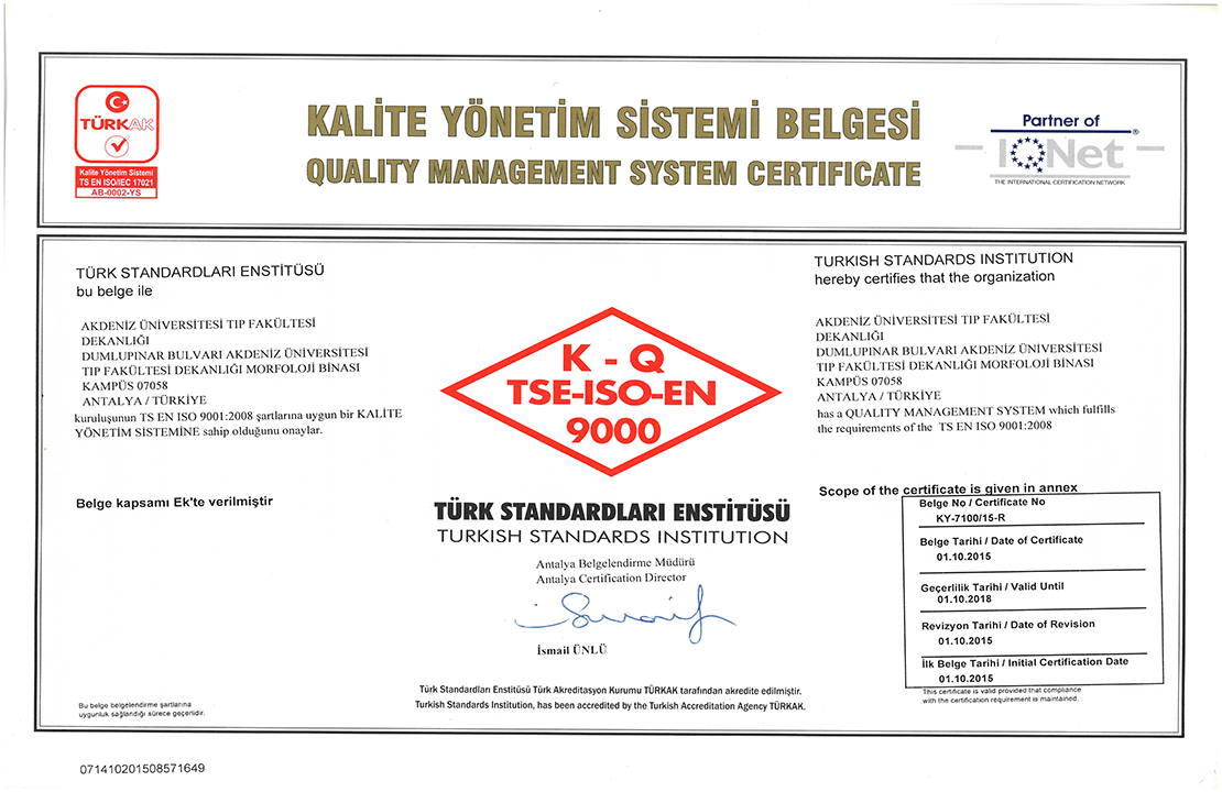 Akreditasyon Belgelerimiz/Sertifikalarımız Sertifikalarımız/Akreditasyon Belgelerimiz KALİTE YÖNETİM SİSTEMİ BELGESİ (25.01.2022 – 25.01.2025) KALİTE YÖNETİM SİSTEMİ BELGESİ EK (25.01.2022 – 25.01.2025) THE INTERNATİONAL CERTİFİCATİON NETWORK (25.01.2022 – 25.01.2025) THE INTERNATİONAL CERTİFİCATİON NETWORK SPOCE OF THE CERTİFİCATE (25.01.2022 – 25.01.2025) KALİTE YÖNETİM SİSTEMİ BELGESİ (15.01.2019 – 15.01.2022) KALİTE YÖNETİM SİSTEMİ BELGESİ EK (15.01.2019 – 15.01.2022) THE INTERNATİONAL CERTİFİCATİON NETWORK (15.01.2019 – 15.01.2022) THE INTERNATİONAL CERTİFİCATİON NETWORK SPOCE OF THE CERTİFİCATE (15.01.2019 – 15.01.2022) KALİTE YÖNETİM SİSTEMİ BELGESİ (01.10.2015 – 01.10.2018) KALİTE YÖNETİM SİSTEMİ BELGESİ EK (01.10.2015 – 01.10.2018) THE INTERNATİONAL CERTİFİCATİON NETWORK (01.10.2015 – 01.10.2018) THE INTERNATİONAL CERTİFİCATİON NETWORK SCOPE OF THE CERTİFİCATE (01.10.2015 – 01.10.2018) TIP EĞİTİMİ PROGRAMLARINI DEĞERLENDİRME VE AKREDİTASYON DERNEĞİ TIP FAKÜLTESİ AKREDİTASYON BELGESİ (01.01.2017) TIP EĞİTİMİ PROGRAMLARINI DEĞERLENDİRME VE AKREDİTASYON DERNEĞİ TIP FAKÜLTESİ AKREDİTASYON BELGESİ (01.01.2023) EUROPEAN BOARD OF UROLOGY CERTİFİCATE OF ACCREDİTATİON (2010-2015) MEDİCAL BOARD OF CALİFORNİA Eklenme tarihi :4.01.2023 14:26:05 Son güncelleme : 18.04.2025 17:26:02